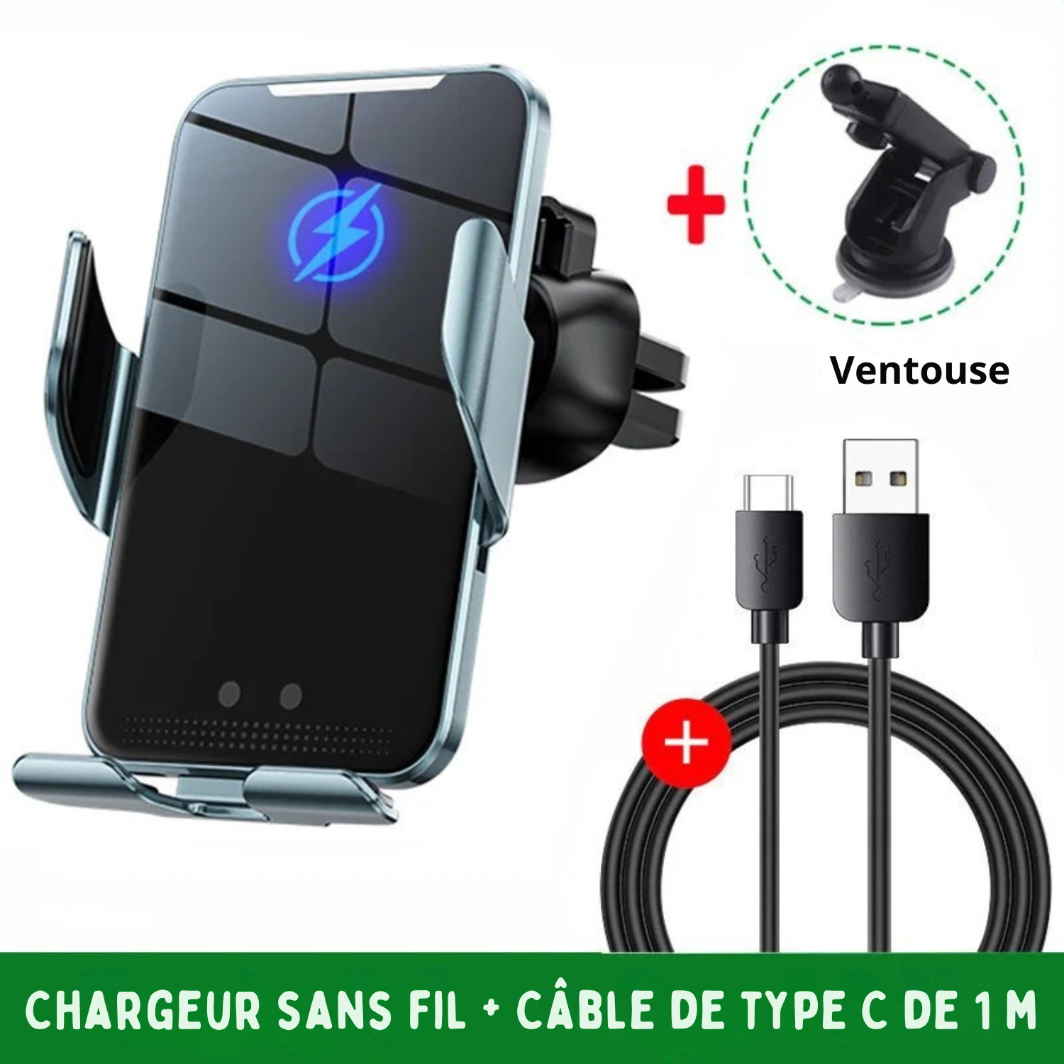 📦 Contenu du pack : Chargeur sans fil, câble USB-C, clip grille d’aération.